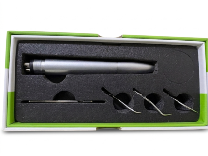 DEM Air Scaler is a pneumatic dental instrument used for removing plaque, calculus, and stains from tooth surfaces. It operates using compressed air from the dental unit, providing efficient scaling with smooth vibration and minimal discomfort for the patient.