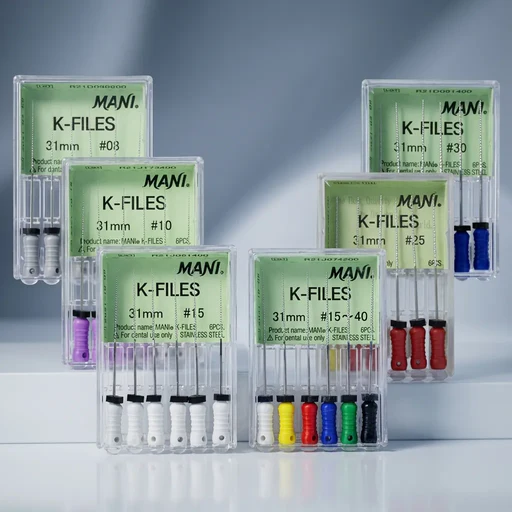 Mani K-Files are precision-engineered manual endodontic instruments designed for effective root canal negotiation, cleaning, and shaping. Made from high-quality stainless steel, they offer excellent flexibility, strength, and cutting efficiency. Their twisted design ensures smooth canal navigation and reliable debris removal, making them ideal for accurate and controlled endodontic procedures.